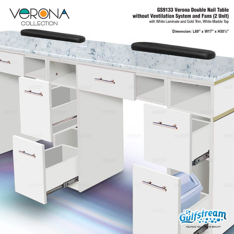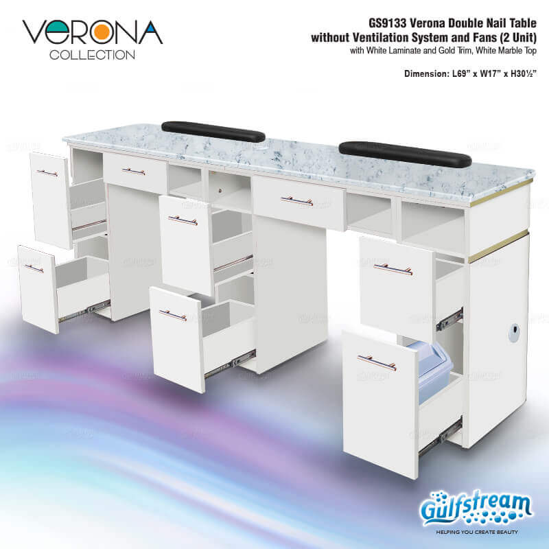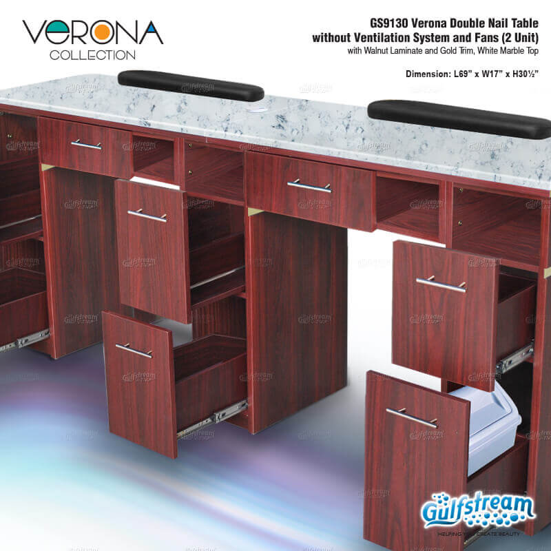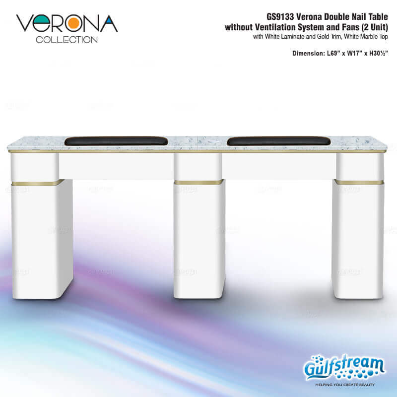 Verona Double Nail Table without Ventilation System and Fans (2 Unit)with Walnut Laminate and Gold Trim, White Marble Top