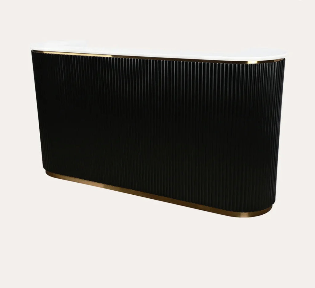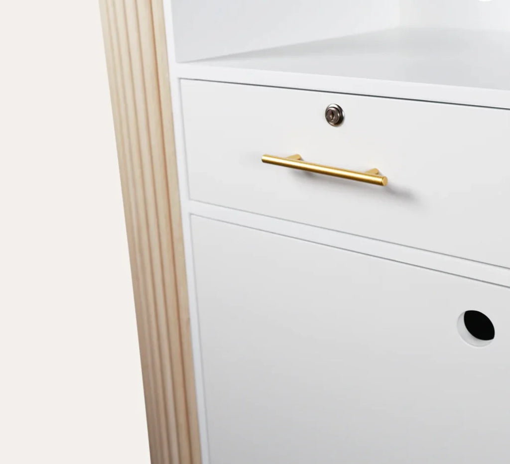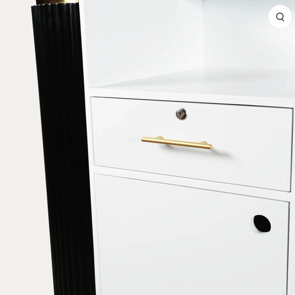 Make your Grand entrance complete with the Grand René Tambour Reception Desk. This luxurious piece includes a large work area for computer, paper work, writing space and plenty of storage for a tidy look. This vintage inspired reception desk gleams with classic lines and features leaving a lasting impression on your guests. Let the Monét Reception Desk be your salon statement piece!