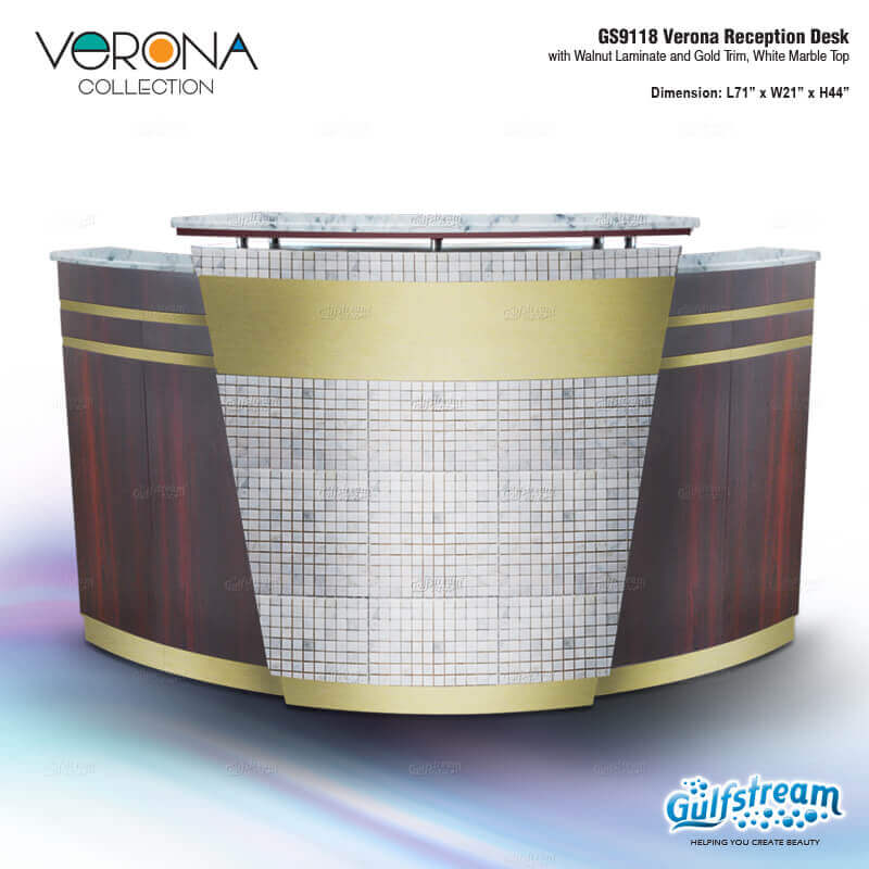 Verona Reception Deskwith Walnut Laminate and Gold Trim, White Marble Top