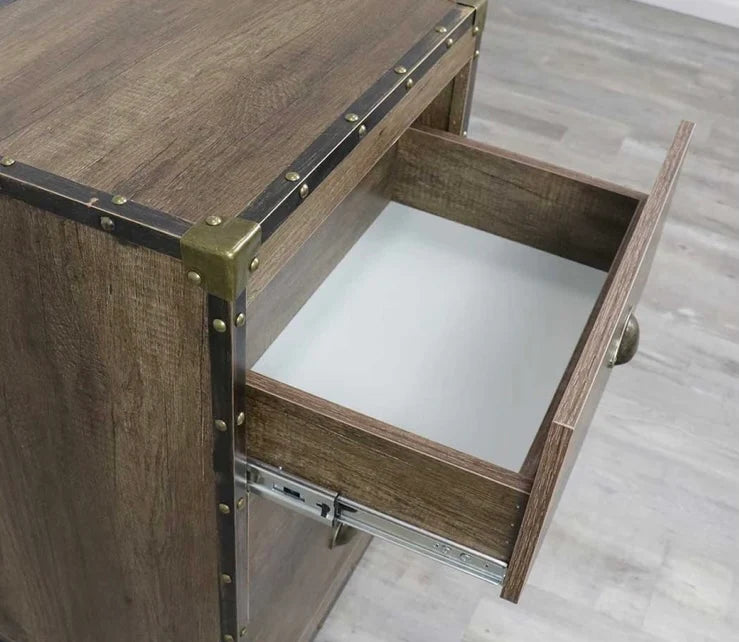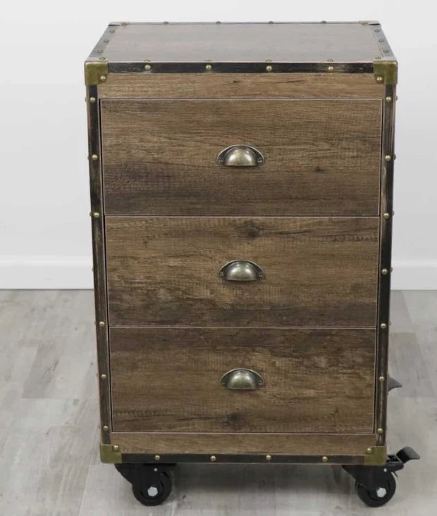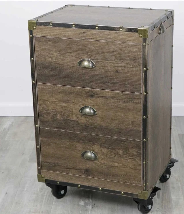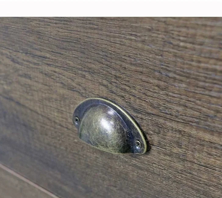 - 3 large pull-out drawers accented with a ventage bin pull handle