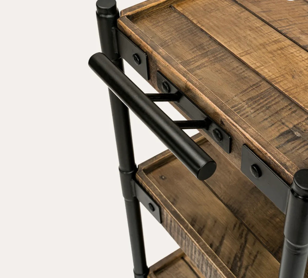 Real Wood Sierra Reclaimed 3-Tier rolling cart is the perfect addition to any shop! Portable, Mobile and with every tool and product right at your fingertips. This unit is a power house of a cart, perfect for storage, product display, utility use and so much more. Pair with our other Riviera Reclaimed Collection products for a matching reclaimed shop layout!