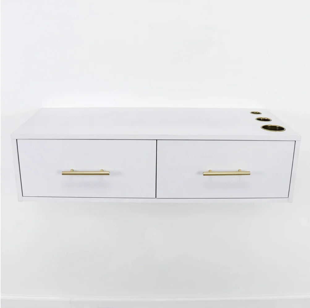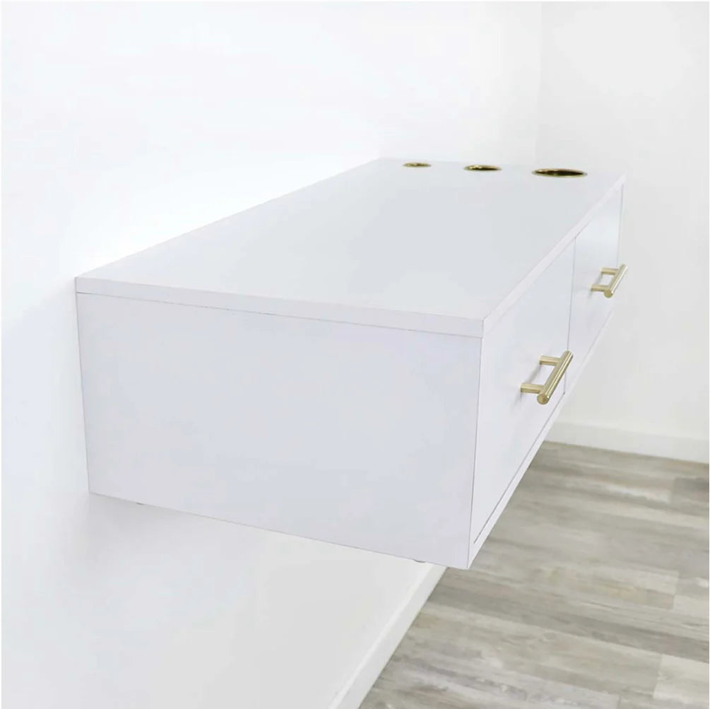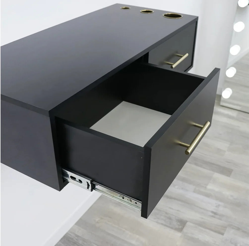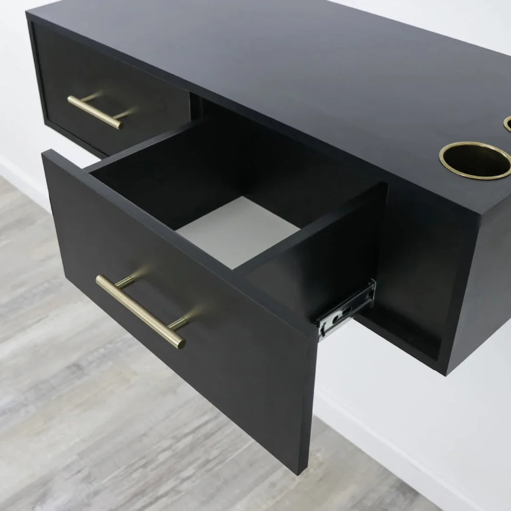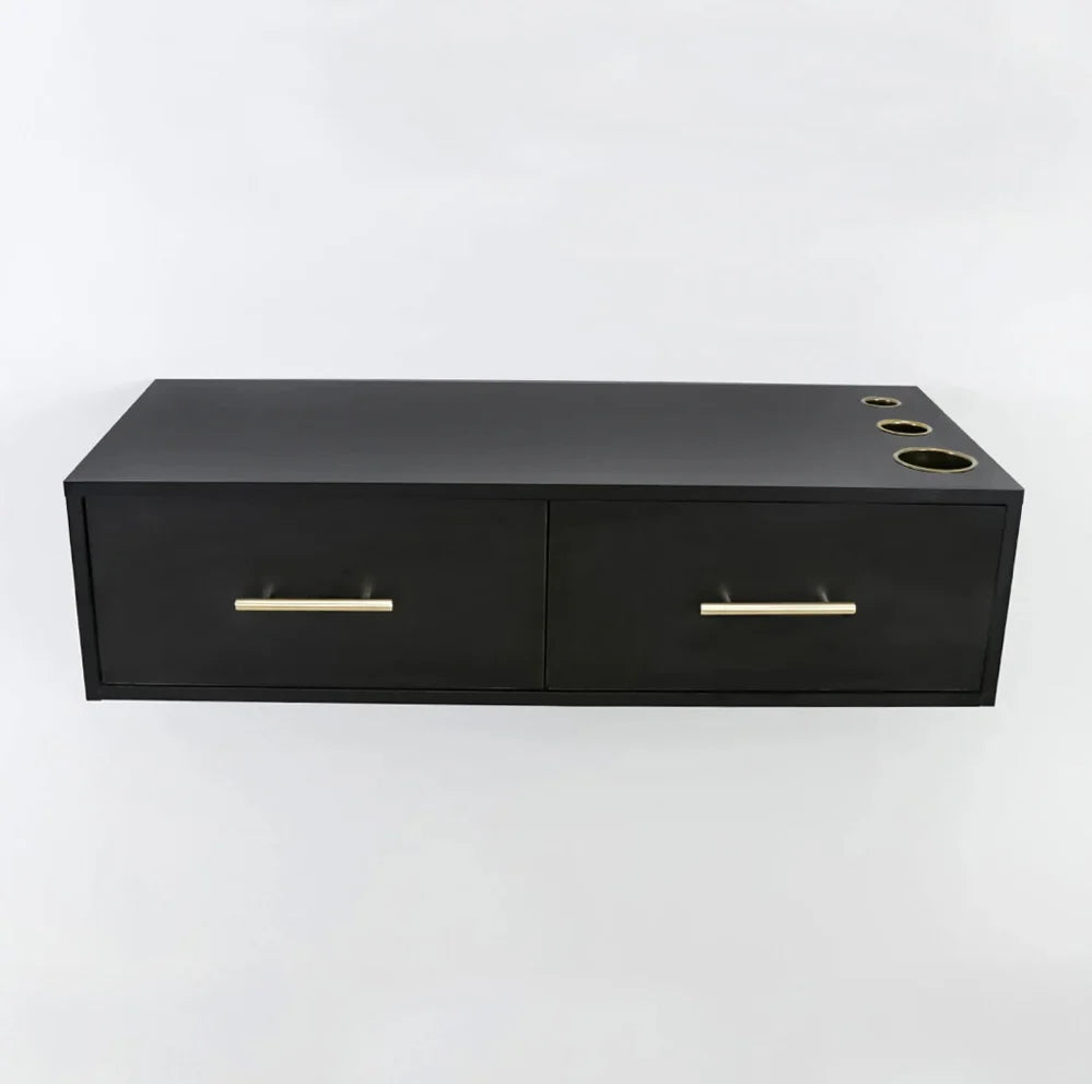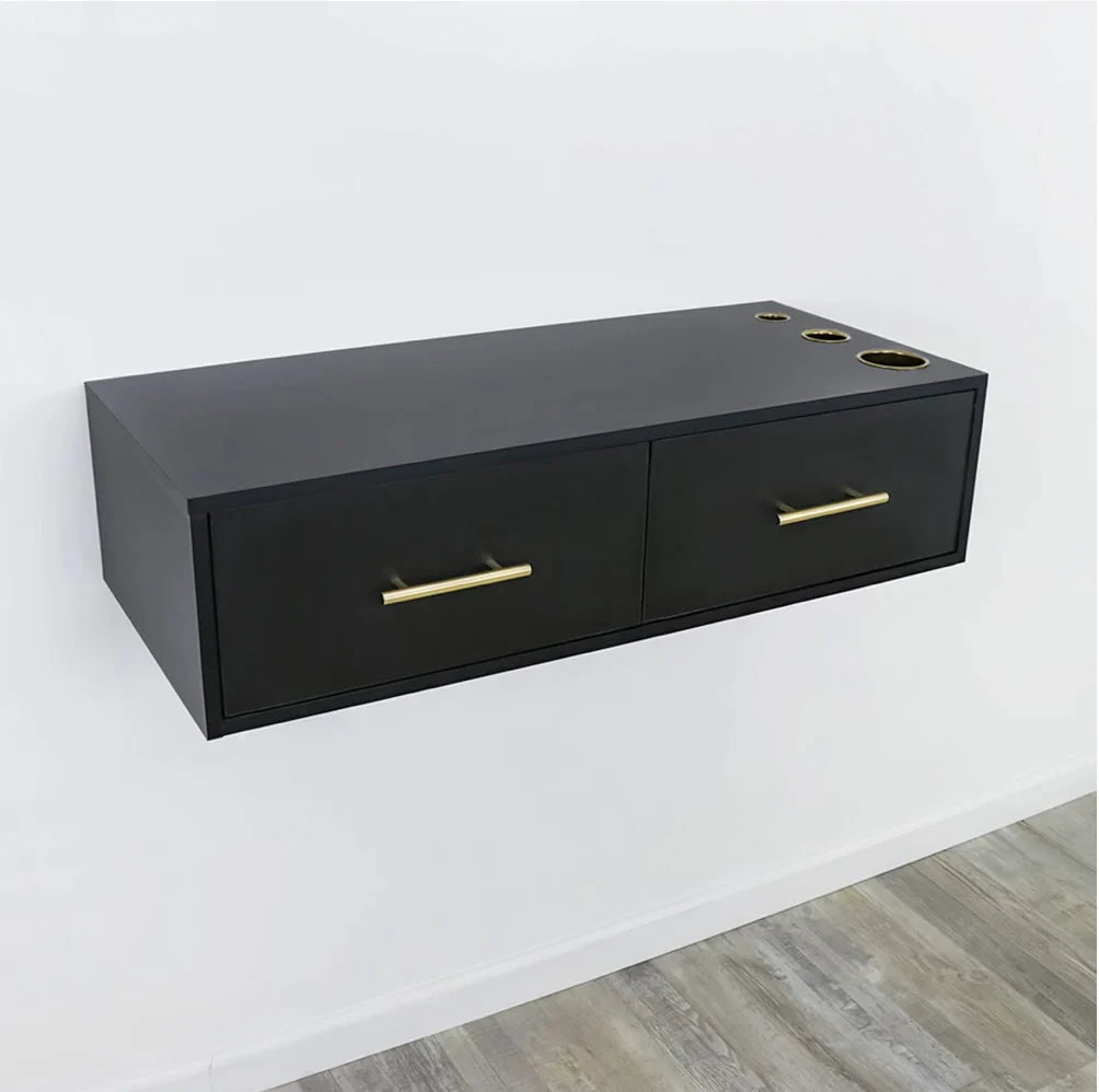 Create a modern space-saving layout in your salon or barbershop with the Broadway Economic Styling Station. This simplistic salon station is excellent for smaller spaces and features handles and appliance holders. Pair this with a mirror for a stunning look!