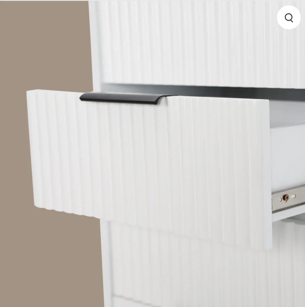 - Made with vertical tambour solid wood in a natural oak stain or solid white