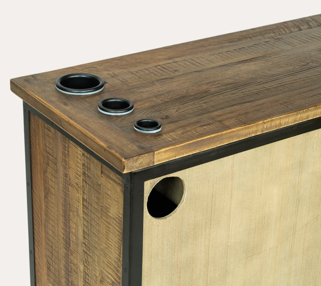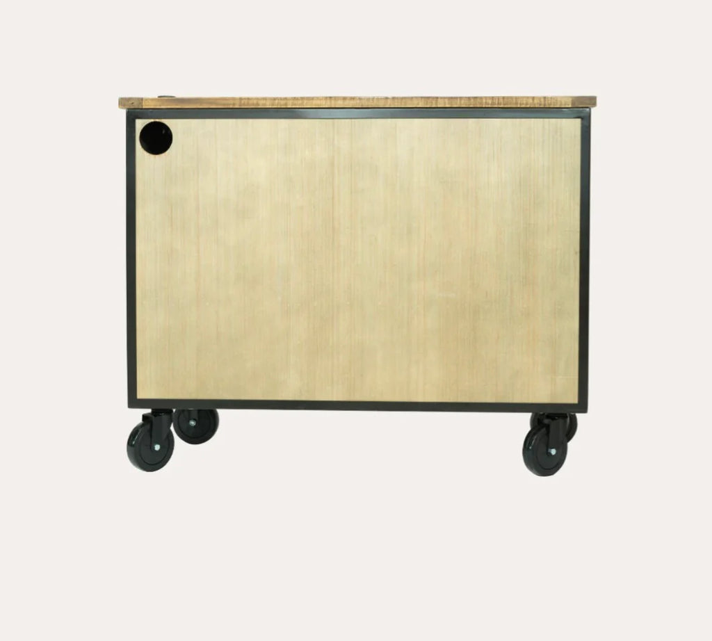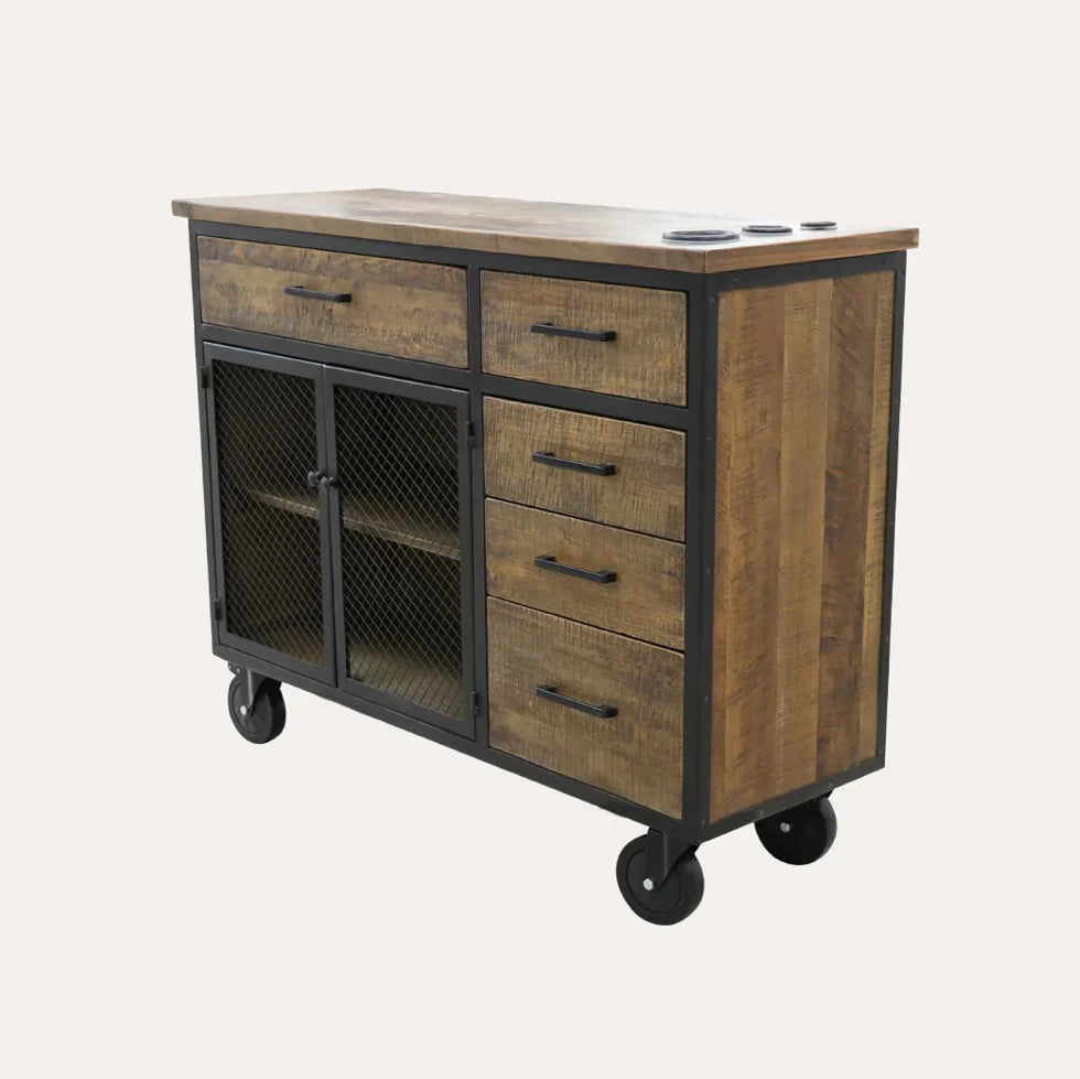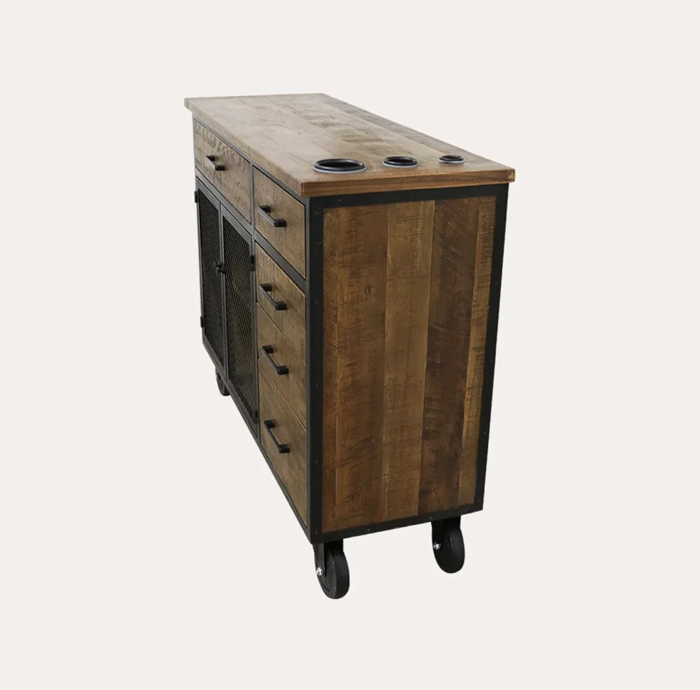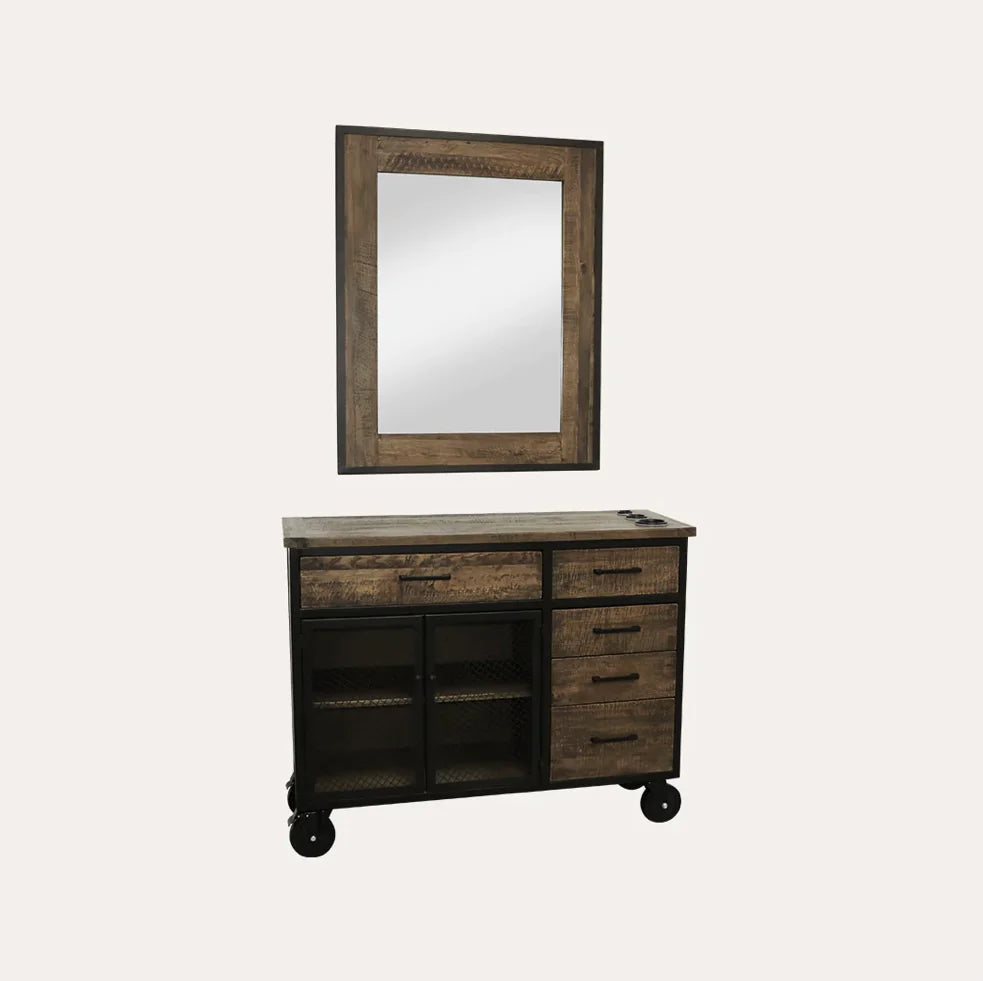 This styling station is the premier option within our Sierra Reclaimed Collection; our largest station on wheels does not disappoint. The natural solid wood carpentry with black metal frame is built to last for seasons in your shop. With a total of five drawers, double cabinets and large working surface area you’ll have all of your supplies and tools right at your fingertips. Take your station to the next level by adding on one of our matching mirror packages.